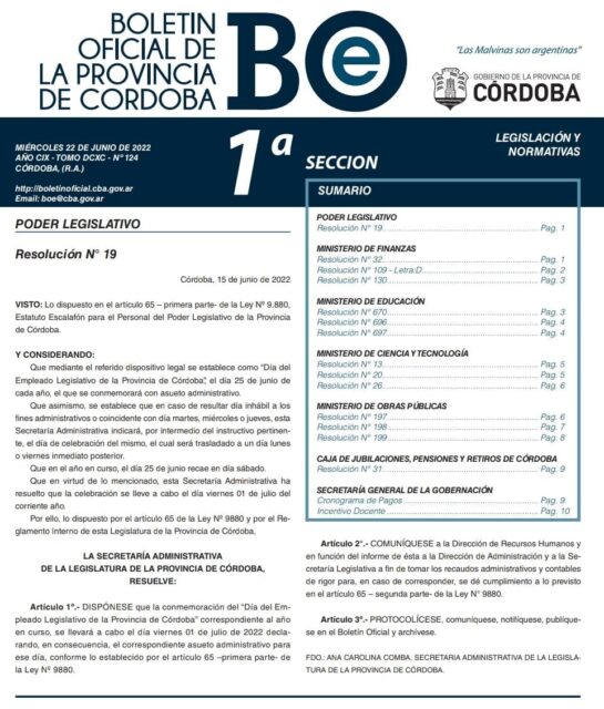 Compañeros legislativos, compartimos la Resolución N°19 del Poder Legislativo emitida en el Boletín Oficial de fecha 22 de junio que declara el asueto administrativo correspondiente al Día del Empleado Legislativo de la Provincia de Córdoba, que se llevará a cabo el día 1 de julio del presente año.