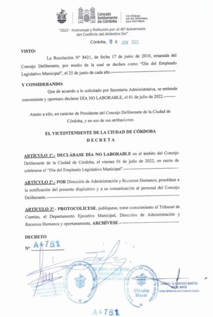 Asimismo, compartimos el Decreto N° A4781 del Concejo Deliberante que declara igualmente día no laborable al 1 de julio.